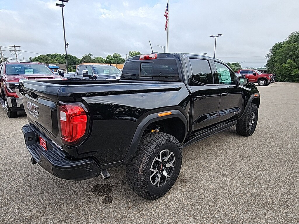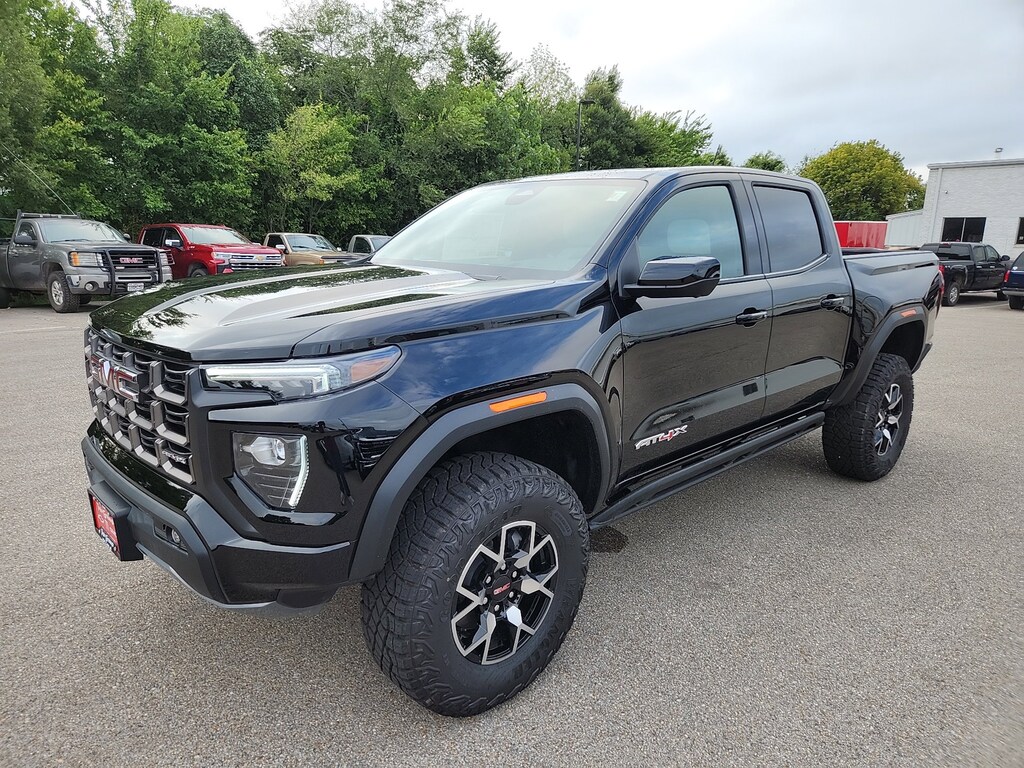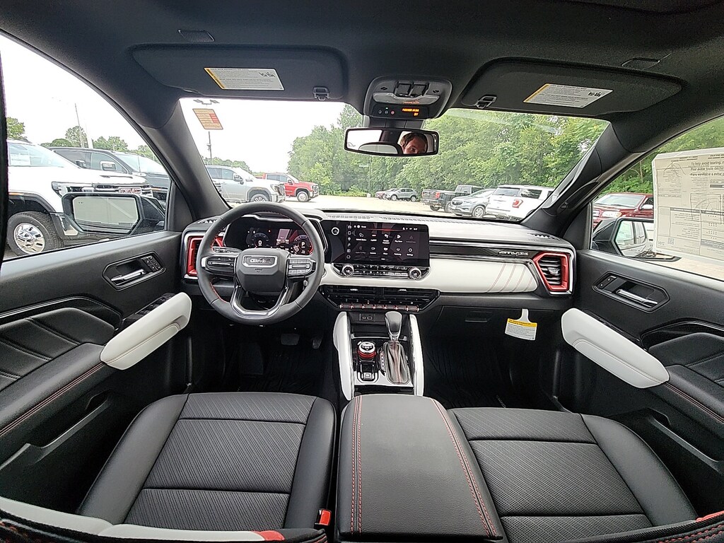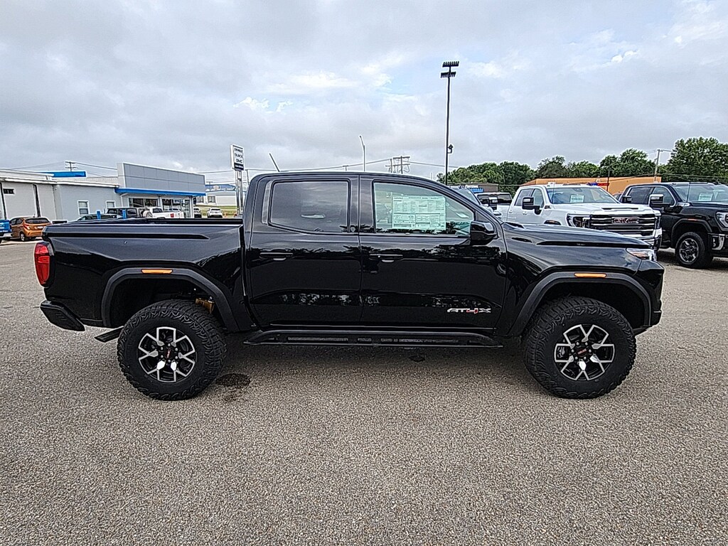 Onyx Black 2025 GMC Canyon AT4 4WD 8-Speed Automatic 2.7L I4 Turbocharged DOHC 16V LEV3-SULEV30 310hp 4WD, 120-Volt Bed Mounted Power Outlet, 1st & 2nd Rows All-Weather Floor Liners (LPO), 2 1st Row USB Charge/Data Ports, 2 Rear USB Ports in Center Console (Charge-Only), 3.42 Rear Axle Ratio, 4-Way Manual Front Passenger Seat Adjuster, 4-Wheel Disc Brakes, 6 Speakers, 6-Speaker Audio System Feature, 6-Way Power Passenger Seat Adjuster, 8-Way Power Driver Seat Adjuster, ABS brakes, Adaptive Cruise Control, Air Conditioning, Alloy wheels, AM/FM radio, Apple CarPlay/Android Auto, AT4 Premium Package, AT4X Package, Auto High-beam Headlights, Auto-dimming Rear-View mirror, Automatic Emergency Braking, Automatic Stop/Start, Automatic temperature control, Black Finish Sport Upper Bodyside Moldings, Black Off-Road Rocker Protection (LPO), Blind Zone Steering Assist w/Trailering, Brake assist, Bumpers: body-color, Canyon Pro Safety, Canyon Safety Plus Package, Cloth/CoreTec Seat Trim, Compass, Delay-off headlights, Driver & Front Passenger Illuminated Visors, Driver & Front Passenger Ventilated Seats, Driver door bin, Driver Memory, Driver Mode Selector, Driver Seatback Map Pocket, Driver vanity mirror, Driver-Selectable Full-Locking Front Differential, Driver-Selectable Full-Locking Rear Differential, Dual front impact airbags, Dual front side impact airbags, Dual-Zone Auto Climate Control Air Conditioning, Electronic Stability Control, Emergency communication system: OnStar, EZ-Lift & Lower Tailgate, Following Distance Indicator, Forward Collision Alert, Front anti-roll bar, Front Bucket Seats, Front Center Armrest, Front dual zone A/C, Front fog lights, Front LED Fog Lamps, Front License Plate Kit, Front Passenger Seatback Map Pocket, Front Pedestrian & Bicyclist Braking, Front reading lights, Front Side Laminated Solar Glazing Glass, Front wheel independent suspension, HD Surround Vision, Heated door mirrors, Heated Driver & Front Passenger Seats, Heated front seats, Heated Steering Wheel, Illuminated entry, Inside Rear-View Auto-Dimming Mirror, Integrated Trailer Brake Controller, IntelliBeam Automatic High Beam On/Off, Interior Overhead Courtesy Light w/Dual Reading Lamp, Laminated Windshield Acoustic Glass, Lane Keep Assist w/Lane Departure Warning, Low tire pressure warning, Multicolor 6.3 Diagonal Head-Up Display, MultiStow Tailgate Storage Compartment, Navigation System, Occupant sensing airbag, Off-Road Suspension, Off-Road Suspension w/3 Lift, Outside temperature display, Overhead airbag, Overhead console, Panic alarm, Passenger door bin, Passenger vanity mirror, Perforated Leather-Appointed Seat Trim, Power door mirrors, Power Driver Lumbar Control Seat Adjuster, Power driver seat, Power Inner Sliding Glass Sunroof w/Manual Shade, Power Passenger Lumbar Control Seat Adjuster, Power steering, Power windows, Preferred Equipment Group 4SG, Premium 7-Speaker Bose Sound System, Radio data system, Radio: 11.3 Diagonal Premium GMC Infotainment Sys, Rear Center Fold-Down Armrest w/2 Cupholders, Rear Cross Traffic Braking, Rear of Console 120-Volt Power Outlet, Rear Pedestrian Alert, Rear reading lights, Rear step bumper, Rear window defroster, Red Seat Belt Color, Remote keyless entry, Remote Vehicle Starter System, Safety Alert Seat, Security system, SiriusXM w/360L, Speed control, Speed-sensing steering, Split folding rear seat, Spray-On Bedliner w/GMC Logo, Steering wheel mounted audio controls, Stop/Start System Disable Button Engine Control, Tachometer, Tailgate Keyed Cylinder Lock, Technology Plus Package, Telescoping steering wheel, Tilt & Telescopic Manual Steering Column, Tilt steering wheel, Traction control, Trailering App System, Trailering Package, Trip computer, Ultrasonic Rear Park Assist, Underbody Cameras, Variably intermittent wipers, Wheels: 17 x 8 Black High Gloss Machined Finish, Wheels: 18 x 8.5 Dark Gray Machined Finish Alum,