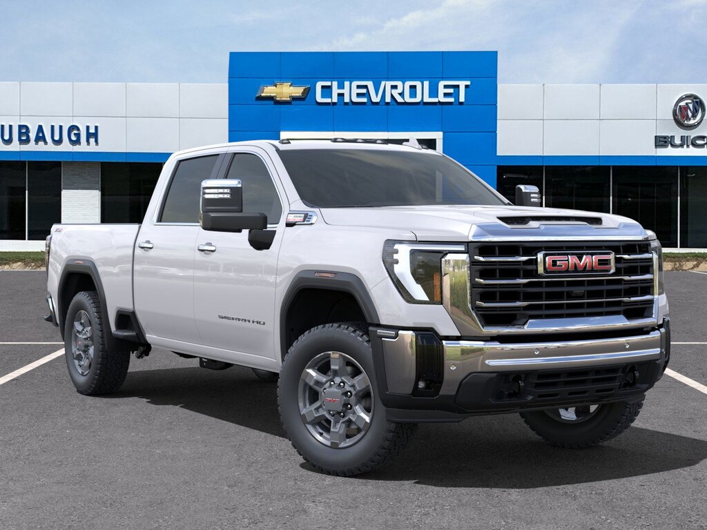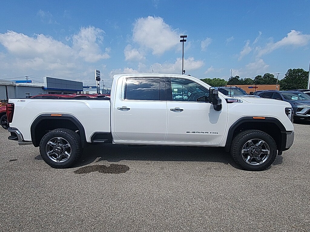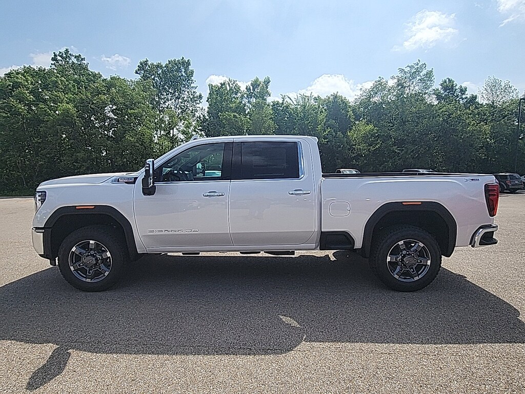 White Frost Tricoat 2025 GMC Sierra 2500HD SLT 4WD 10-Speed Automatic Duramax 6.6L V8 Turbodiesel 10-Speed Automatic, 4WD, Black Leather, 10-Way Power Driver Seat Adjuster w/Lumbar, 10-Way Power Passenger Seat Adjuster w/Lumbar, 120-Volt Bed Mounted Power Outlet, 120-Volt Instrument Panel Power Outlet, 18 Machined Aluminum Wheels, 2 Charge-Only Rear USB Ports, 2 Charge/Data USB Ports, 2 Charge/Data USB Ports Inside Center Console, 2-Speed Active Transfer Case, 220-Amp Alternator, 4-Wheel Disc Brakes, 6 Speakers, 6-Speaker Audio System Feature, ABS brakes, Adaptive Cruise Control, Air Conditioning, Alloy wheels, AM/FM radio: SiriusXM with 360L, Apple CarPlay/Android Auto, Auto High-beam Headlights, Auto-dimming door mirrors, Auto-dimming Rear-View mirror, Automatic Emergency Braking, Automatic temperature control, Bed View Camera w/2 Trailer Camera Provisions, Bose Premium 7-Speaker Sound System, Brake assist, Buckle to Drive, Bumpers: chrome, Chrome Surround Grille w/Chrome Insert Bars, Compass, Deep-Tinted Glass, Delay-off headlights, Driver door bin, Driver Memory, Driver vanity mirror, Dual front impact airbags, Dual front side impact airbags, Electric Rear-Window Defogger, Electronic Stability Control, Emergency communication system: OnStar, Engine Block Heater, Exhaust Brake, Floor-Mounted Center Console, Following Distance Indicator, Forward Collision Alert, Front 40/20/40 Split-Bench Seats, Front anti-roll bar, Front Bucket Seats, Front Center Armrest w/Storage, Front dual zone A/C, Front fog lights, Front License Plate Kit, Front Pedestrian Braking, Front Rain-Sensing Wipers, Front reading lights, Front wheel independent suspension, Fully automatic headlights, HD Rear Vision Camera Delete, HD Surround Vision, Heated 2nd Row Outboard Seats, Heated door mirrors, Heated Driver & Front Outboard Passenger Seats, Heated front seats, Heated steering wheel, Heavy-Duty 80 Amp Battery, Hill Descent Control, Hitch Guidance w/Hitch View, Illuminated entry, In-Vehicle Trailering System App, IntelliBeam Automatic High Beam On/Off, Keyless Open & Start, Lane Departure Warning System, LED Cargo Area Lighting, LED Smoked Amber Roof Marker Lamps, Low tire pressure warning, Manual Tilt-Wheel/Telescoping Steering Column, Memory seat, Occupant sensing airbag, Off-Road Suspension, OnStar Services Capable, Outside temperature display, Overhead airbag, Overhead console, Panic alarm, Passenger door bin, Passenger vanity mirror, Perf Leather-Appointed Front Outboard Seat Trim, Pickup Box, Power door mirrors, Power driver seat, Power Front Passenger Windows w/Express Up/Down, Power passenger seat, Power Sliding Rear Window w/Defogger, Power steering, Power windows, Preferred Equipment Group 4SA, Push Button Start, Radio: AM/FM w/Premium GMC Infotainment System, Rain sensing wipers, Rear Cross Traffic Alert, Rear reading lights, Rear seat center armrest, Rear step bumper, Rear Wheelhouse Liners, Rear window defroster, Remote keyless entry, Remote Vehicle Starter System, Safety Alert Seat, Security system, Sierra HD Pro Safety Plus Package, SiriusXM w/360L Trial Subscription, SLT