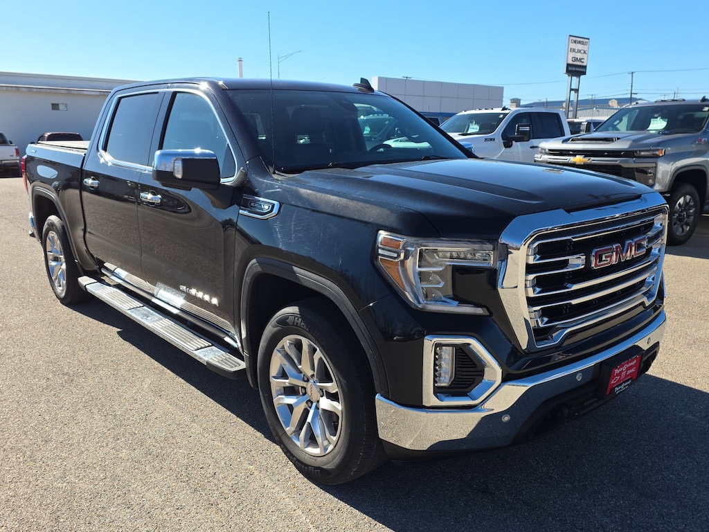 Leather, Remote Start, Bluetooth, Rear Camera, Intelink Radio, Heated Seats, Cooled Seats, Apple CarPlay, Android Auto, Sierra 1500 SLT, 4D Crew Cab, EcoTec3 5.3L V8, 8-Speed Automatic, 4WD, Onyx Black, Jet Black Leather, 10-Way Power Driver Seat Adjuster w/Lumbar, 10-Way Power Passenger Seat Adjuster w/Lumbar, 12-Volt Rear Auxiliary Power Outlet, 120-Volt Bed Mounted Power Outlet, 120-Volt Instrument Panel Power Outlet, 170 Amp Alternator, 2 USB Ports, 2 USB Ports (1st Row), 20 x 9 Polished Aluminum Wheels, 3.23 Rear Axle Ratio, 4-Wheel Disc Brakes, 6 Speakers, 6-Speaker Audio System Feature, ABS brakes, Air Conditioning, All-Weather Floor Liner (LPO), Alloy wheels, AM/FM radio: SiriusXM, Apple CarPlay/Android Auto, Auto-dimming door mirrors, Auto-dimming Rear-View mirror, Automatic temperature control, Auxiliary External Transmission Oil Cooler, Brake assist, Bumpers: chrome, Chrome Assist Steps, Chrome Grille, Color-Keyed Carpeting Floor Covering, Compass, Deep-Tinted Glass, Delay-off headlights, Driver Alert Package I, Driver Alert Package II, Driver door bin, Driver Memory, Driver vanity mirror, Dual front impact airbags, Dual front side impact airbags, Electric Rear-Window Defogger, Electrical Lock Control Steering Column, Electronic Stability Control, Floor Mounted Console, Following Distance Indicator, Forward Collision Alert, Front 40/20/40 Split-Bench Seat, Front anti-roll bar, Front Bucket Seats, Front Center Armrest w/Storage, Front dual zone A/C, Front fog lights, Front Frame-Mounted Black Recovery Hooks, Front License Plate Kit, Front Pedestrian Braking, Front reading lights, Front wheel independent suspension, Fully automatic headlights, GMC 4G LTE, GMC Connected Access, HD Radio, Heated 2nd Row Outboard Seats, Heated door mirrors, Heated Driver & Front Passenger Seating, Heated front seats, Heated steering wheel, Heavy Duty Suspension, Heavy-Duty Rear Locking Differential, Hitch Guidance, Hitch Guidance w/Hitch View, Illuminated entry, In-Vehicle Trailering App, Integrated Trailer Brake Controller, IntelliBeam Automatic High Beam On/Off, Keyless Open & Start, Lane Change Alert w/Side Blind Zone Alert, Lane Keep Assist w/Lane Departure Warning, LED Cargo Area Lighting, Low Speed Forward Automatic Braking, Low tire pressure warning, Manual Tilt-Wheel & Telescoping Steering Column, Memory seat, Occupant sensing airbag, OnStar & GMC Connected Services Capable, Outside temperature display, Overhead airbag, Overhead console, Panic alarm, Passenger door bin, Passenger vanity mirror, Perforated Leather-Appointed Seat Trim, Perimeter Lighting, Power Door Locks, Power door mirrors, Power driver seat, Power Front Passenger Windows w/Express Up/Down, Power Front Windows w/Driver Express Up/Down, Power passenger seat, Power Rear Windows w/Express Down, Power Sliding Rear Window w/Rear Defogger, Power steering, Power windows, Preferred Equipment Group 4SA, Premium audio system: GMC Infotainment System, Premium Bose 7-Speaker Sound System, Radio data system, Radio: Premium GMC Infotainment Sys w/Multi-Touch, Radio: Premium GMC Infotainment Sys w/Navigation, Rear Cross Traffic Alert, Rear Dual USB Charging-Only Ports, Rear reading lights, Rear seat center armrest, Rear step bumper, Rear Wheelhouse Liners, Rear window defroster, Remote keyless entry, Remote Vehicle Starter System, Safety Alert Seat, Security system, SiriusXM Radio, SLT Convenience Package, SLT Preferred Package, SLT Premium Plus Package, Speed control, Speed-sensing steering, Split folding rear seat, Spray-On Pickup Bed Liner w/GMC Logo, Steering Wheel Audio Controls, Steering wheel mounted audio controls, Tachometer, Telescoping steering wheel, Theft Deterrent System (Unauthorized Entry), Tilt steering wheel, Traction control, Trailer Tire Pressure Monitor System, Trailering Package, Trip computer, Ultrasonic Front & Rear Park Assist, Universal Home Remote, Variably intermittent wipers, Ventilated Driver & Fron