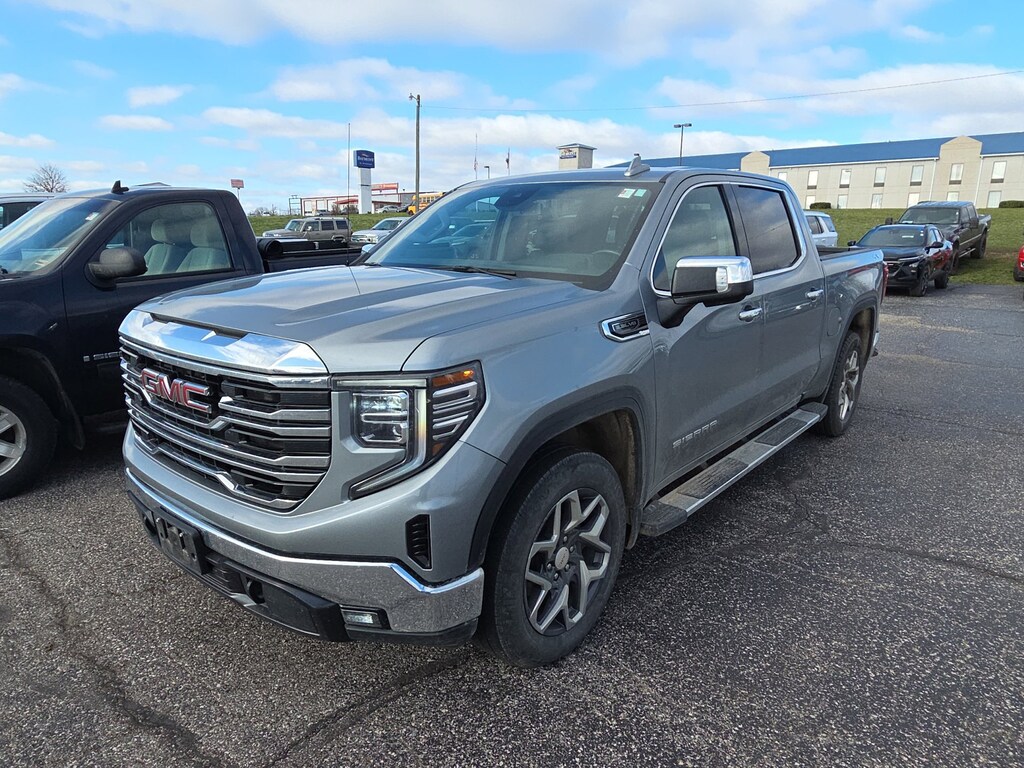 Leather, Remote Start, Bluetooth, Rear Camera, Intelink Radio, One Owner, Local Trade, Heated Seats, Cooled Seats, Apple CarPlay, Android Auto, Sierra 1500 SLT, 4D Crew Cab, EcoTec3 5.3L V8, 10-Speed Automatic, 4WD, Sterling Metallic, Jet Black Leather, 10-Way Power Driver Seat Adjuster w/Lumbar, 10-Way Power Passenger Seat Adjuster w/Lumbar, 120-Volt Bed Mounted Power Outlet, 120-Volt Instrument Panel Power Outlet, 170 Amp Alternator, 2 Charge/Data USB Ports, 2 Charge/Data USB Ports Inside Center Console, 2 Type-C Charge-Only Rear USB Ports, 20 Polished Aluminum Wheels, 3.23 Rear Axle Ratio, 4-Wheel Disc Brakes, 6 Speakers, 6-Speaker Audio System Feature, ABS brakes, Air Conditioning, Alloy wheels, AM/FM radio, Apple CarPlay/Android Auto, Auto High-beam Headlights, Auto-dimming door mirrors, Auto-dimming Rear-View mirror, Auto-Locking Rear Differential, Automatic Emergency Braking, Automatic temperature control, Auxiliary External Transmission Oil Cooler, Brake assist, Buckle to Drive, Bumpers: chrome, Chrome Header & Chrome Grille Insert Bars, Chrome Wheel To Wheel Assist Steps, Color-Keyed Carpeting Floor Covering, Compass, Deep-Tinted Glass, Delay-off headlights, Driver door bin, Driver Memory, Driver vanity mirror, Dual front impact airbags, Dual front side impact airbags, Electric Rear-Window Defogger, Electrical Steering Column Lock, Electronic Precision Shift, Electronic Stability Control, Emergency communication system: OnStar and GMC connected services capable, Floor-Mounted Center Console, Following Distance Indicator, Forward Collision Alert, Front 40/20/40 Split-Bench Seat, Front anti-roll bar, Front Bucket Seats, Front Center Armrest w/Storage, Front dual zone A/C, Front fog lights, Front Frame-Mounted Black Recovery Hooks, Front License Plate Kit, Front Pedestrian Braking, Front Rainsensing Wipers, Front reading lights, Front wheel independent suspension, Fully automatic headlights, GMC Connected Access Capable, HD Rear Vision Camera, Heated door mirrors, Heated Driver & Front Outboard Passenger Seating, Heated front seats, Heated steering wheel, High Capacity Suspension Package, Hitch Guidance, Illuminated entry, IntelliBeam Automatic High Beam On/Off, Keyless Open & Start, Lane Keep Assist w/Lane Departure Warning, LED Cargo Area Lighting, Low tire pressure warning, Manual Tilt-Wheel & Telescoping Steering Column, Memory seat, Navigation System, Not Equipped w/Steering Column Lock, Occupant sensing airbag, OnStar & GMC Connected Services Capable, Outside temperature display, Overhead airbag, Overhead console, Panic alarm, Passenger door bin, Passenger vanity mirror, Perf Leather-Appointed Front Outboard Seat Trim, Perimeter Lighting, Power Door Locks, Power door mirrors, Power driver seat, Power Front Passenger Windows w/Express Up/Down, Power Front Windows w/Driver Express Up/Down, Power passenger seat, Power Rake & Telescoping Steering Column, Power Rear Windows w/Express Down, Power steering, Power windows, Preferred Equipment Group 4SA, Premium audio system: GMC Infotainment System, Premium Bose 7-Speaker Sound System, Push Button Start, Radio data system, Radio: Premium GMC Infotainment Audio System, Rain sensing wipers, Rear reading lights, Rear seat center armrest, Rear step bumper, Rear Wheelhouse Liners, Rear window defroster, Remote keyless entry, Remote Vehicle Starter System, Security system, SiriusXM w/360L, SLT Convenience Package, SLT Premium Package, Speed control, Speed-sensing steering, Split folding rear seat, Standard Suspension Package, Steering Wheel Audio Controls, Steering wheel mounted audio controls, Tachometer, Telescoping steering wheel, Theft Deterrent System (Unauthorized Entry), Tilt steering wheel, Traction control, Trailering Package, Trip computer, Variably intermittent wipers, Ventilated Driver & Front Passenger Seats, Voltmeter, Wheels: 18 x 8.5 6-Spoke Machined Aluminum, Wi-Fi Hotspot Capable, Wireless Charging, Wireless Phone Projection, Sierra 1500 SLT, 4D Crew Cab